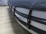 По всему периметру чехла внизу вшита прочная резинка, имеются люверсы по всему периметру (от 10 до 18 шт., в зависимости от длины судна). Люверсы усилены вставками из прочной ткани, через них продевается ременная лента, которая закрепляется либо под днищем лодки с помощью фастексов, либо крепится к прицепу.